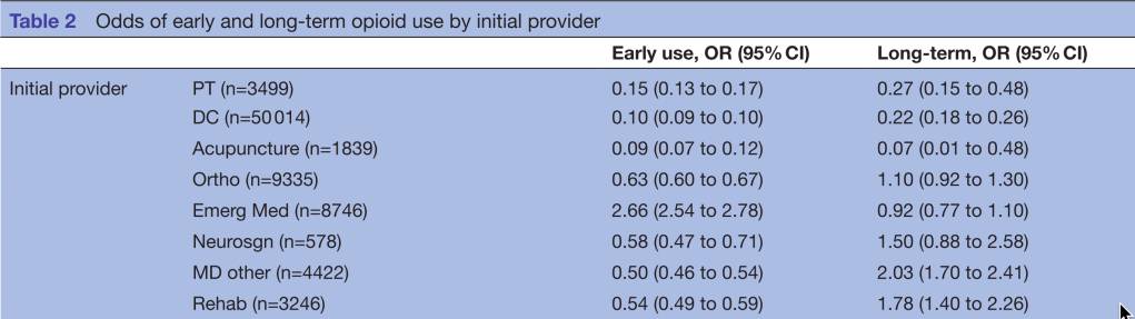 Their results show that short-term use of opioids in their sample was 22%. But the big news was that patients who received their initial treatment from chiropractors or physical therapists had substantially reduced odds of short-term and long-term opioid use compared with those who received initial treatment from primary care physicians – an order of magnitude difference!