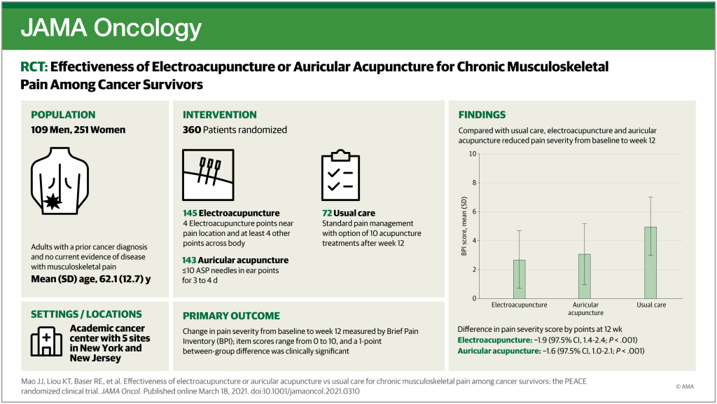 1 Mao JJ, Liou KT, Baser RE, et al. Effectiveness of Electroacupuncture or Auricular Acupuncture vs Usual Care for Chronic Musculoskeletal Pain Among Cancer Survivors: The PEACE Randomized Clinical Trial. JAMA Oncol Published Online First: 18 March 2021. doi:10.1001/jamaoncol.2021.0310