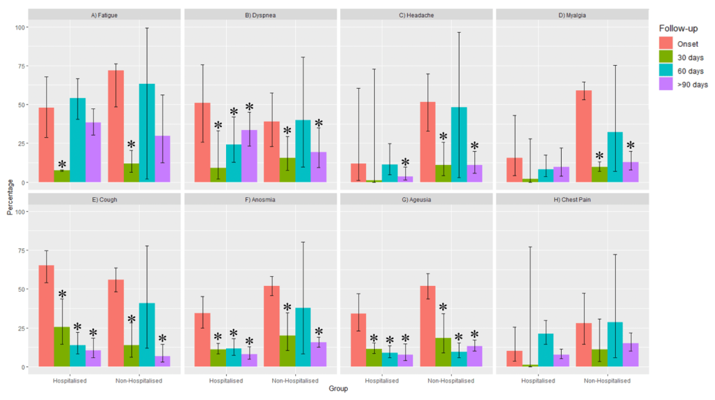 César and his team have gone on to evaluate the time course of the 8 most prevalent COVID-related symptoms and shown that there is a “rolling coaster pattern”, to quote one of his recent letters.[5] In a meta-analysis of 33 studies and 24 255 patients (15 244 hospitalised and 9011 non-hospitalised) they found that symptoms decrease from onset to 30 days, but increase at 60 days and decrease again at 90 days.[6]