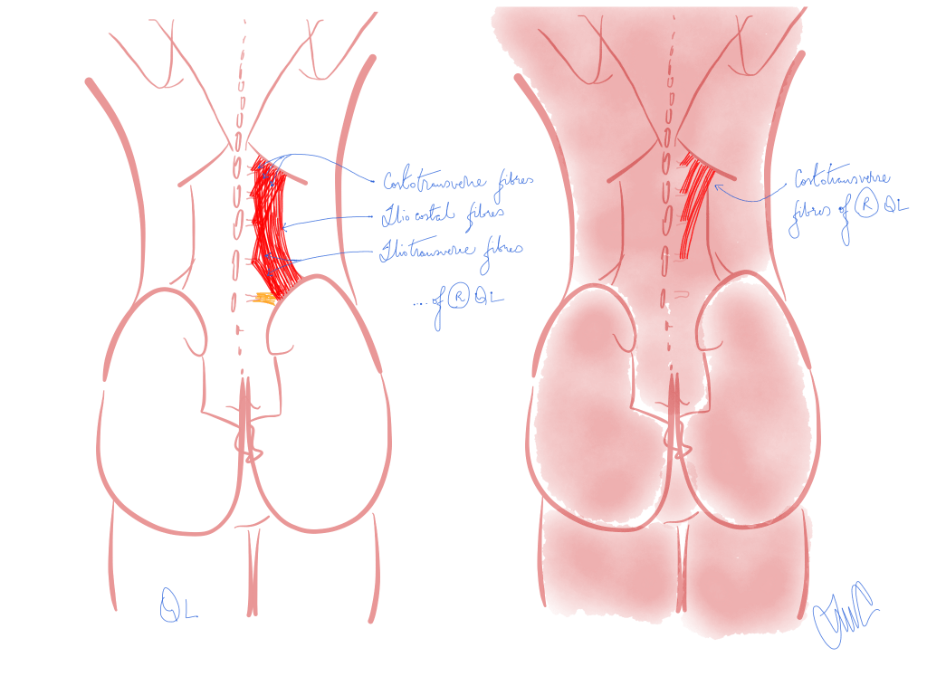 Drawing by MC to illustrate the 3 different sets of fibres making up QL (left) and the just the costotransverse fibres (right).
