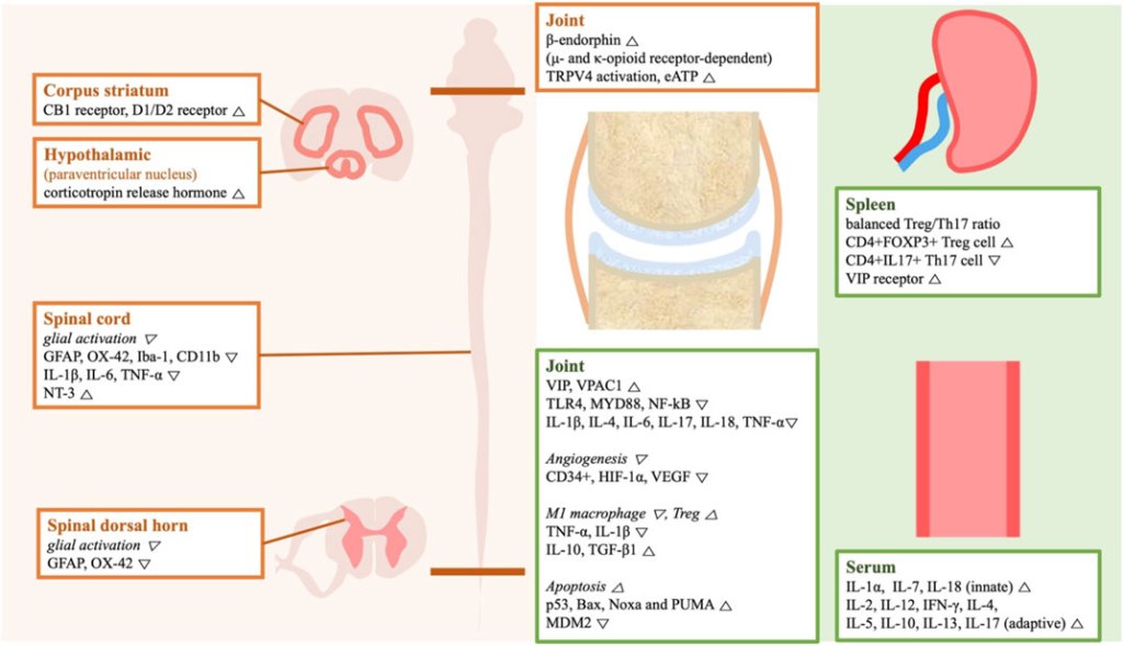 A large number of different mechanisms were investigated by the included studies, but in summary, acupuncture tends to lower pro-inflammatory cytokines and promote mechanisms to reduce inflammation, such as reducing M1 macrophage polarization and increasing regulatory T cell populations.