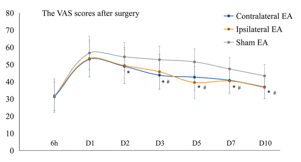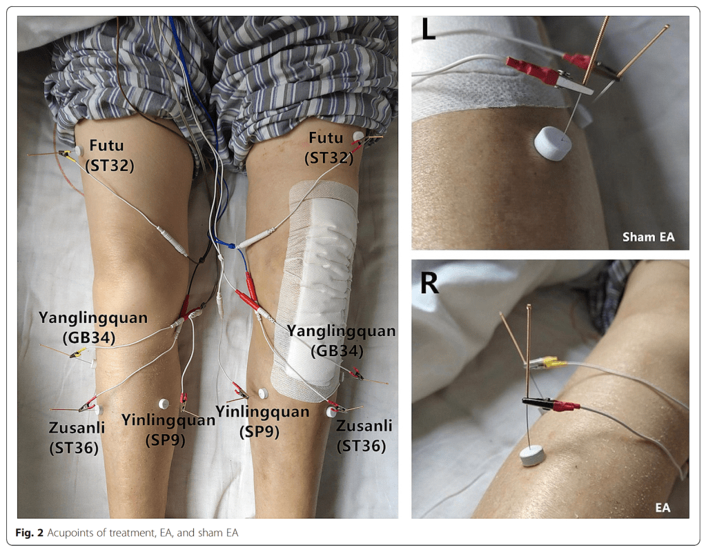 The EA protocol connected ST32 to ST36 and SP9 to GB34 according to the image in the Trials publication, although the text in both papers mention a slightly different arrangement, presumably in error. A low frequency (2Hz) was applied at a relatively low intensity of 1mA and a pulse width of 250μs for 30 minutes on days 1, 2, and 3 post-op. Outcomes were measured at baseline, after EA on days 1, 2, and 3, and at follow-up on day 5, 7, and 10.