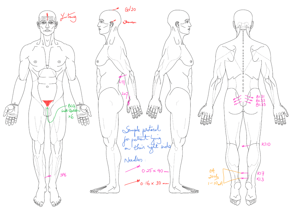 Patients received acupuncture side-lying on their favourite side and the protocol involved unilateral points in the limbs, bilateral points over the sacrum (BL31, BL32, BL33), midline points (Yintang, GV20), and one ear point on the upper side (Shenmen).