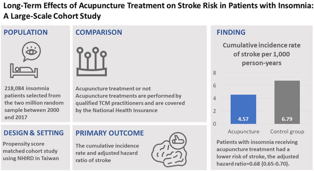 1 Huang C-H, Lin S-K, Lin H-J, et al. Clinical effects of acupuncture treatment for prevention of insomnia-induced stroke: A large-scale cohort study. J Tradit Complement Med. 2024;S2225411024000865. doi: 10.1016/j.jtcme.2024.07.003