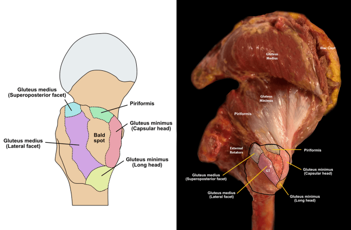 The useful cadaveric image above was found for me by ChatGPT5.2, but it was not able to tell me exactly where the image came from. When I asked for a citable reference, I was given a well cited paper from the journal Radiology (IF 15.2),[5] but the images in this paper all appear to be of MRI scans, and the title suggests it was more focussed on bursae than gluteus medius attachments, although the two are clearly related.
