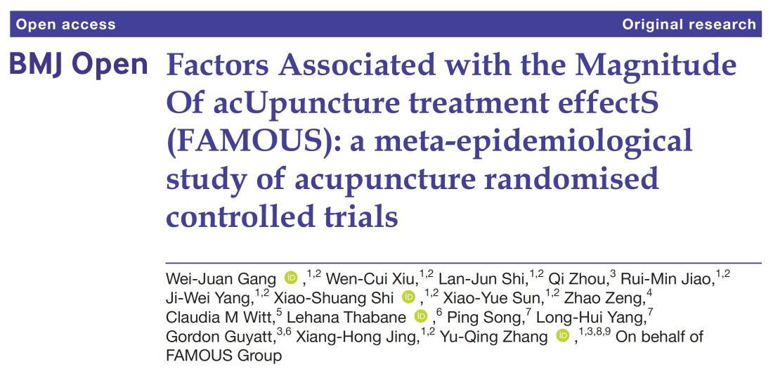 Inspired by Gang et al 2022.[1] SMD – standardised mean difference (effect size)MA – manual acupunctureEA – electroacupunctureTENS – transcutaneous electrical nerve stimulationTEAS – TENS over acupuncture points key to acronyms This is the ninth of the BMJ Series of papers titled Acupuncture: How to improve the evidence base. It comes with the less than … Continue reading The FAMOUS study 2022